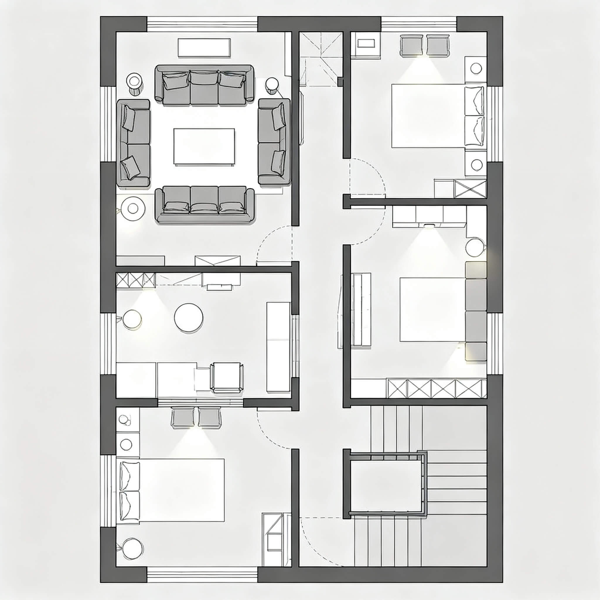 Natural light makes spaces feel bigger, warmer, and more pleasant. Bright homes also use less artificial lighting and can save ~20-30% on energy. Without enough windows, rooms feel dark and cramped. When planning, place larger windows or glass doors in south- or west-facing walls if possible. Tools like Arcadium let you experiment by adding windows and simulating light, so you can be sure each room gets enough daylight.