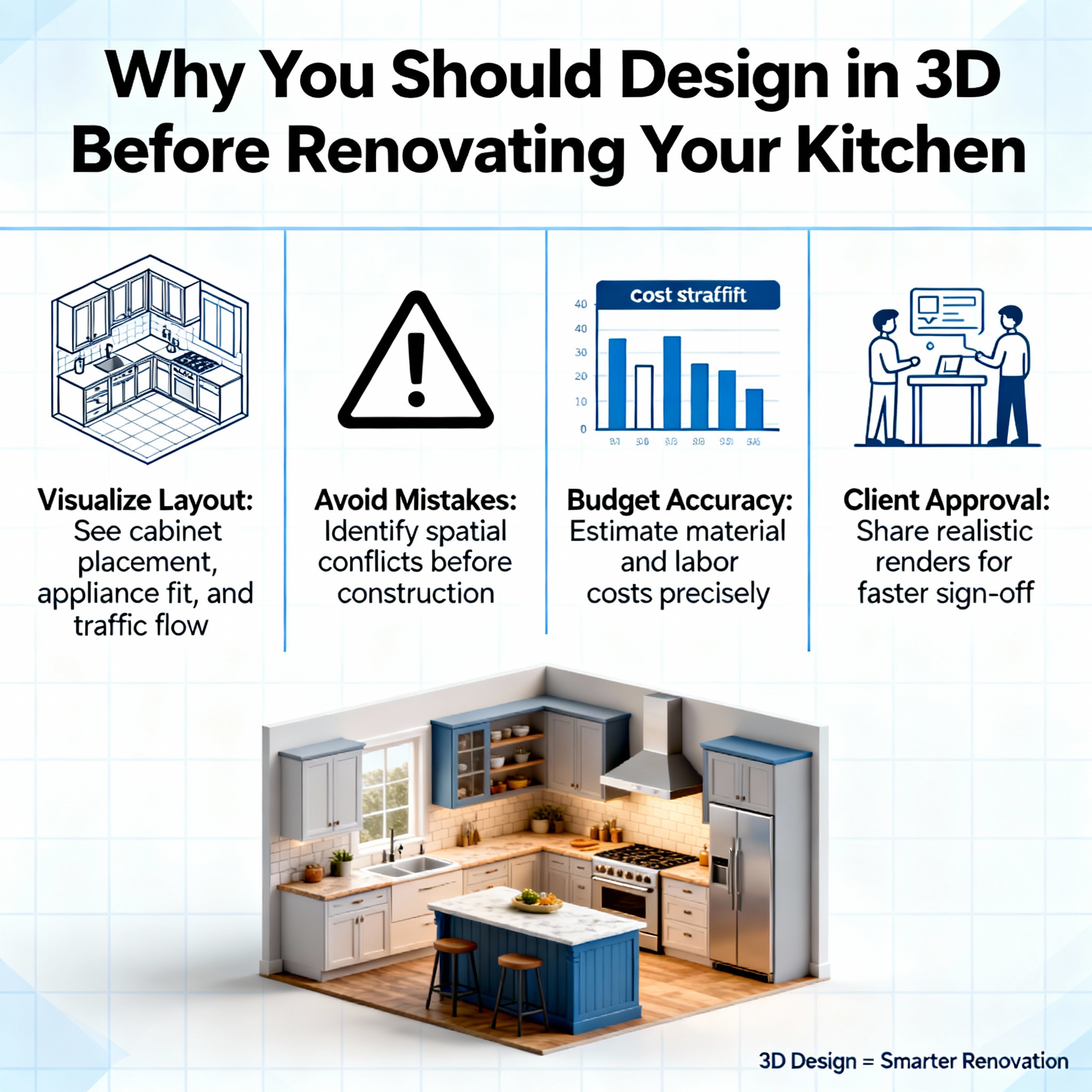 Kitchen remodels are notorious for costly mistakes – ordering the wrong size appliance, choosing a cabinet style that doesn’t fit, or realizing after install that the layout doesn’t flow. Such errors lead to change orders, wasted materials, and budget overruns. Designing everything in 3D first is like having an insurance policy against these mistakes.